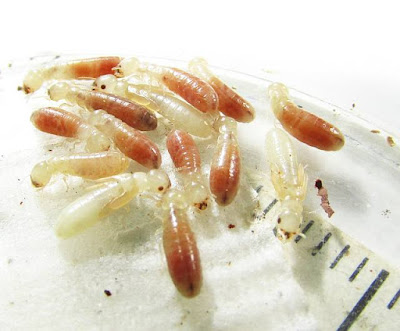 Newly hatch larva or nymph and soldier of Cryptotermes secundus. The nymph is among the largest of newly hatched termites with a body that is particularly large, much larger (generally) than those newly hatch nymphs of many to most termites.